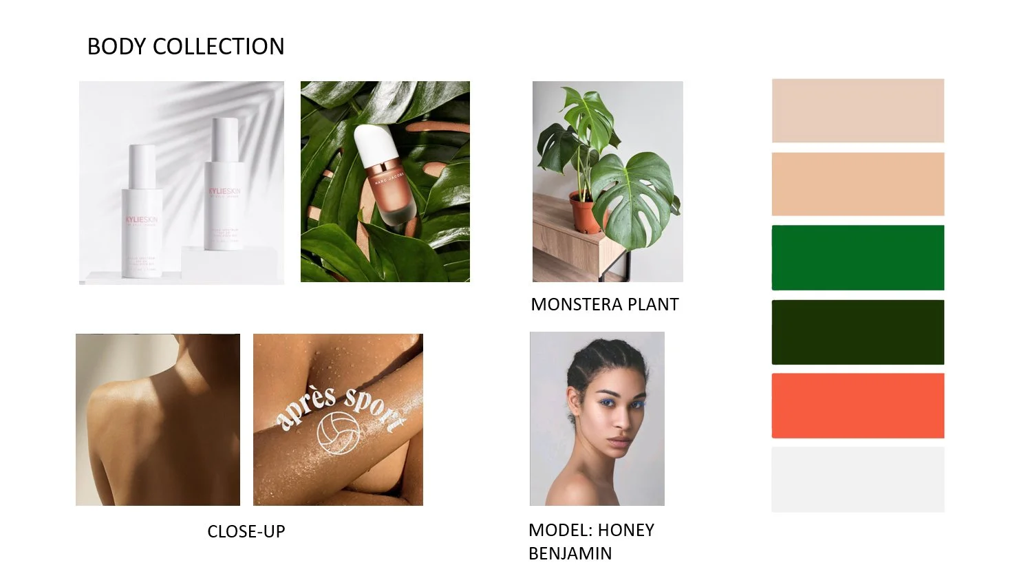 Moodboard establishing model selection, foliage, and color relationships between skin tones, background, and product.