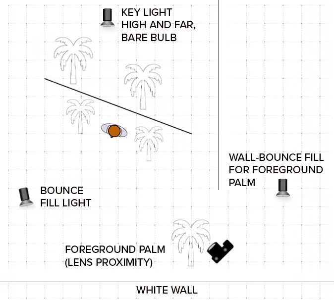 The key light replicates hard sunlight on a cloudless day. Bounced fill softens shadows. A foreground palm was positioned near the lens to introduce a soft blur, enhancing depth and reinforcing the outdoor illusion.